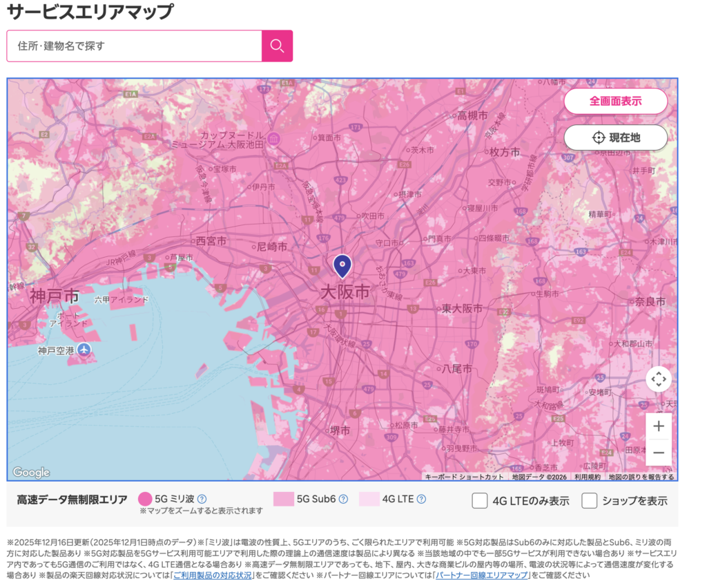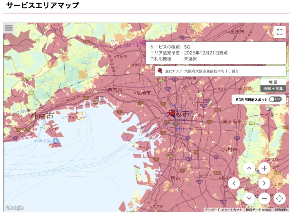 正直、ピンクの範囲だけで言えば、大手以上に範囲は広いので必要十分すぎます。(https://www.docomo.ne.jp/area/service_area/map/?icid=CRP_AREA_service_area_txt25_to_CRP_AREA_service_area_map&rgcd=06&cmcd=5G&scale=64000&lat=34.683044&lot=135.522473より)(URL長い)